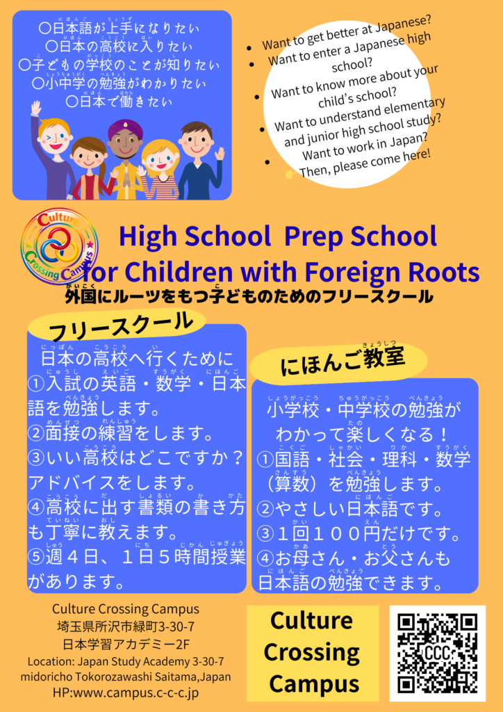 Culture Crossing Campus(CCC)は、埼玉県初の外国にルーツを持つ方のためのフリースクールです。ここでは日本の高校進学を目指しているけれでも、まだ日本語力が足らない方に、日本語と数学や英語などの教科指導を行っています。また、地域に住む方には、レベルに合わせた日本語教室を開設しています。それ以外でも日本語でお困りの方は無料で日本語のサポートが受けられる体制をとっています。